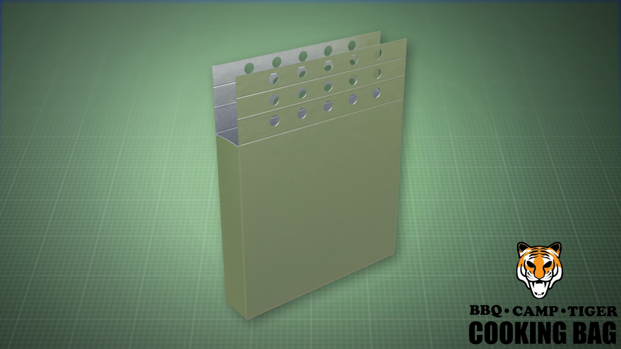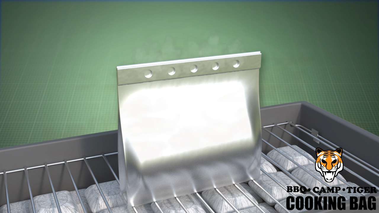 The BBQ Camp Tiger Cooking Bag is a special aluminum foil bag for cooking over hot coals on a barbeque grill, fire, or oven.
