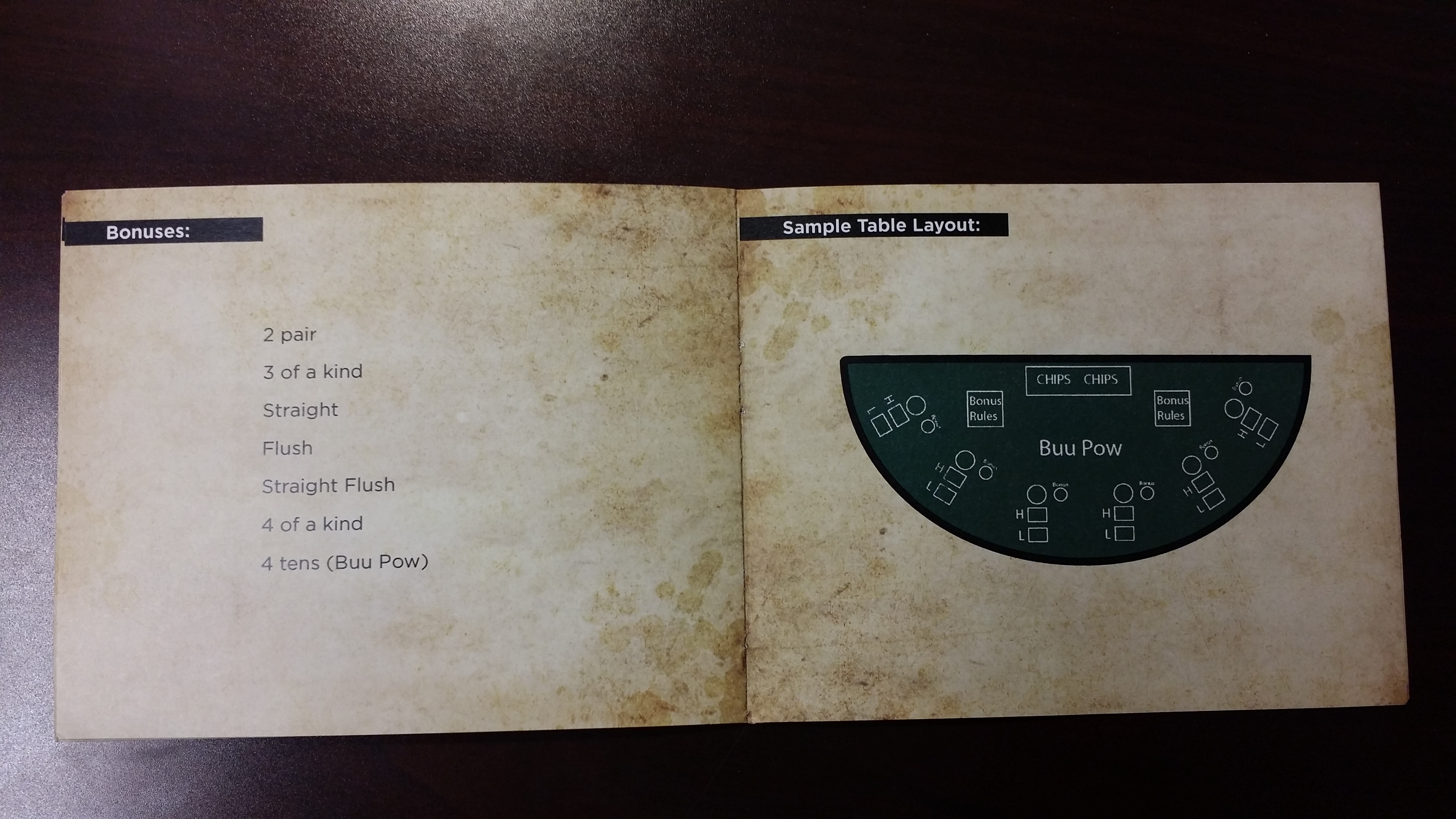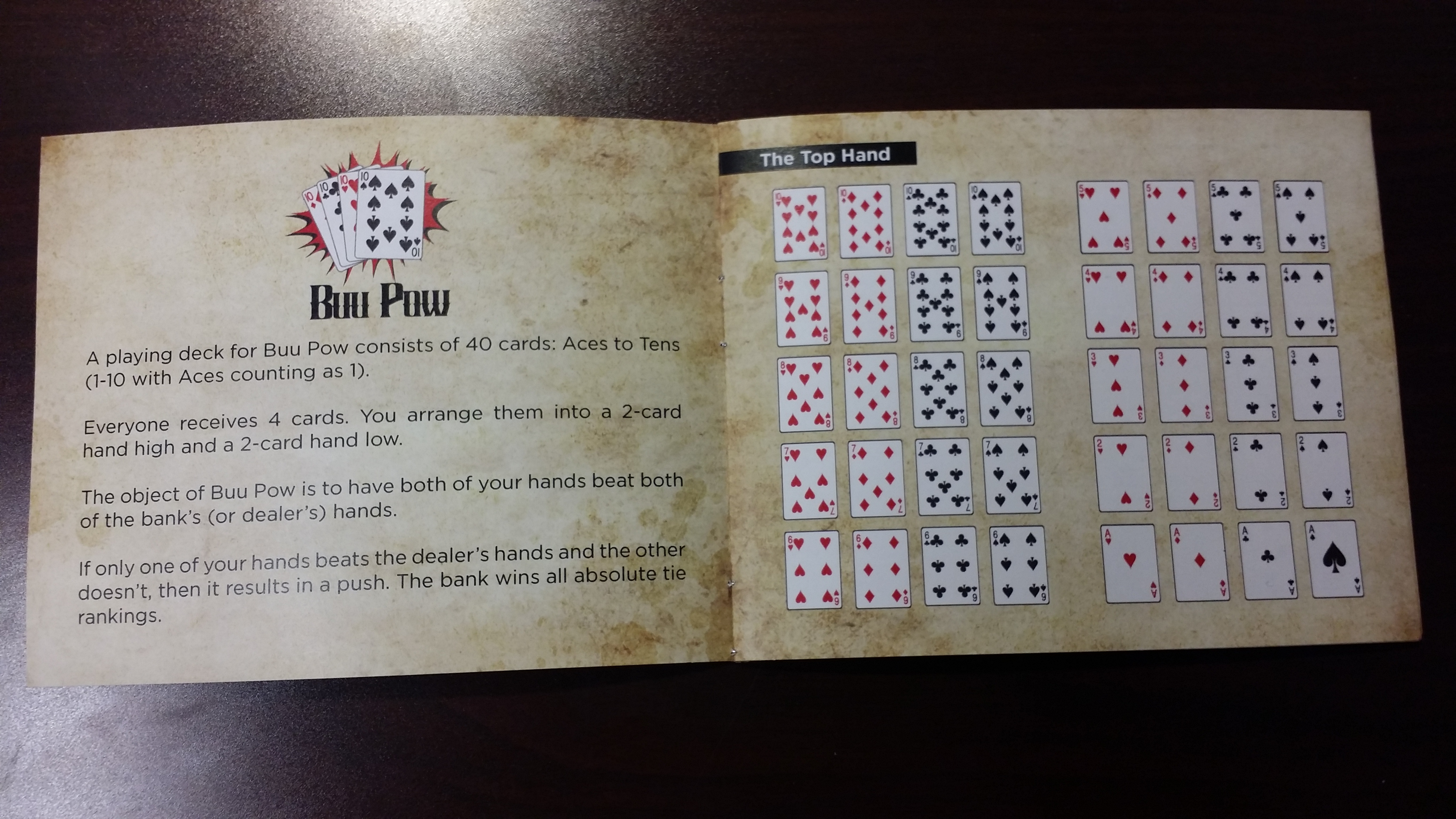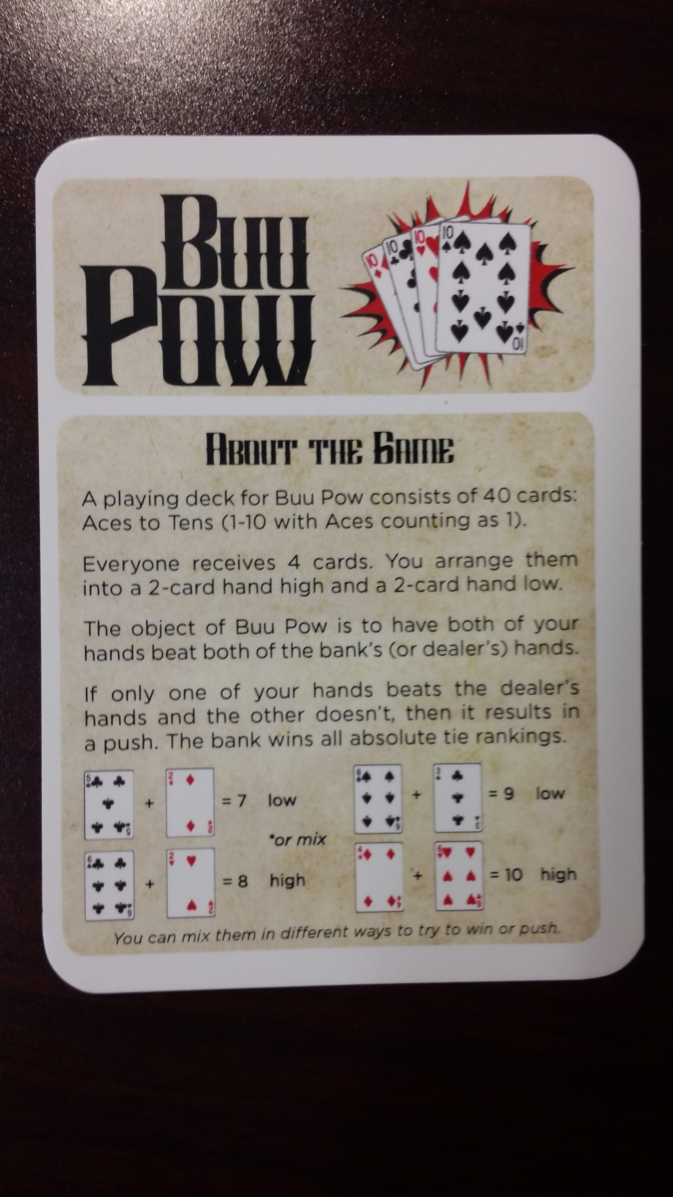 Now they can enjoy hours of playing time with Buu Pow! This clever new game is easy to play and understand. It will keep players in the casino for longer. The playing deck consists of 40 cards. The object of the game is for a player to have both their hands beat both of the dealer's hands. Act now and join in on the fun!/p>