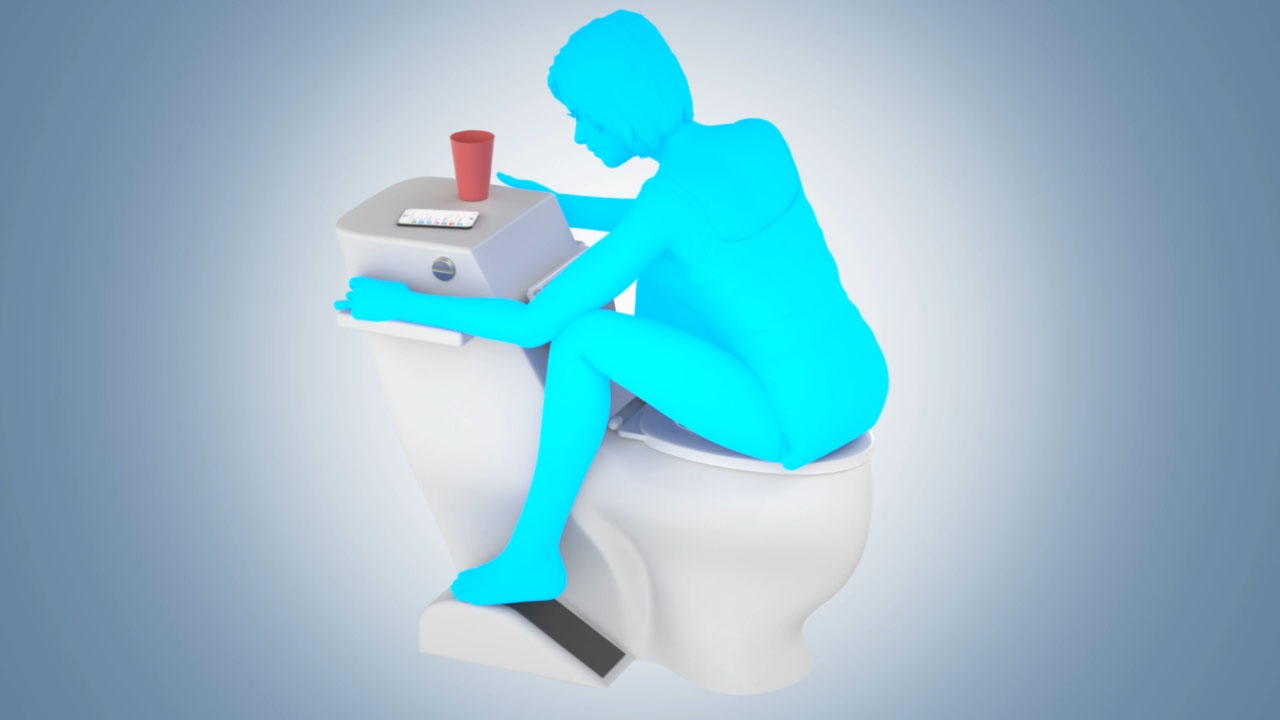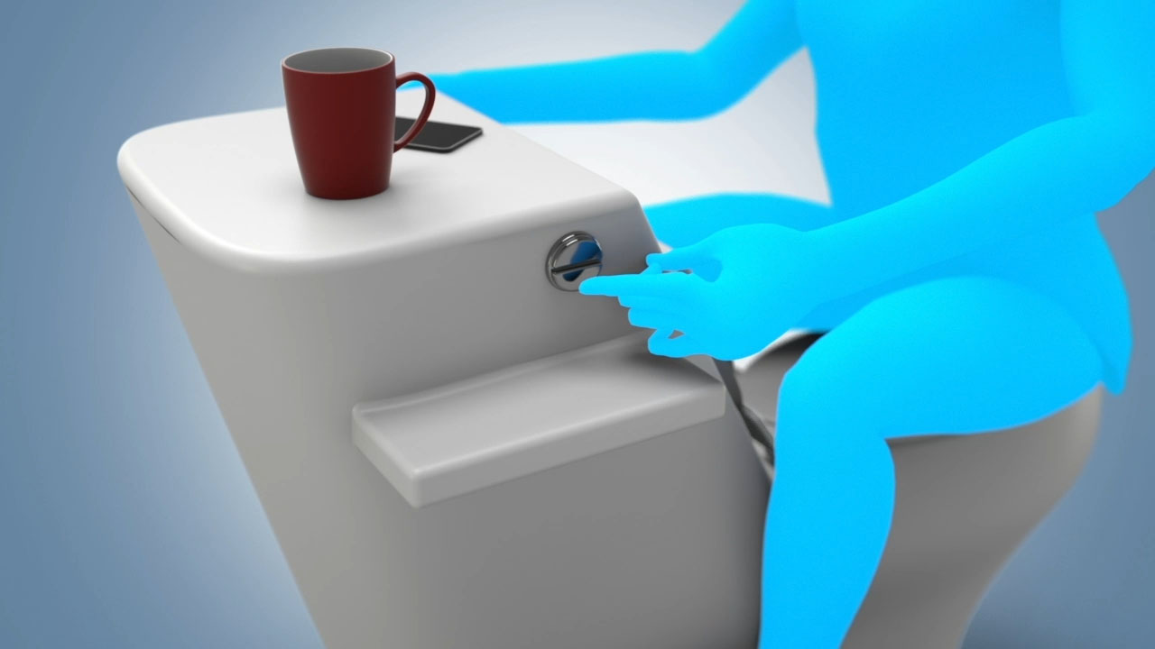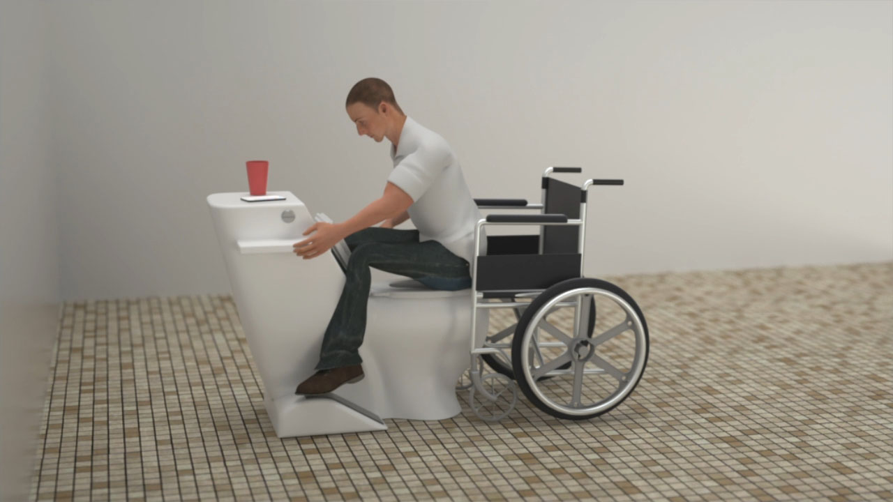 The Courtesy 180™ is a novel and stylishly designed toilet that places our body in an ergonomically correct position, mimicking a squat that relaxes the muscles while straightening the rectum for a quicker and more complete release.Foot ramps are just one of the unique features of the Courtesy 180™. The foot ramps raise the knees of a user up to the ideal positioning higher than the hip to mimic squatting and provide maximum release with minimal effort.The handles will help everyone that needs assistance in sitting and rising. The handles also provide an excellent place to lean forward on as opposed to your knees. The tank top provides a clean and visible place to set your phone, drink, keys, magazines, etc. instead of the unsanitary floor. No more reaching around to find the flusher. The two-part flusher is conveniently placed right in front of you. The top half of the flusher uses half the amount of water and is ideal for pre-wetting the bowl or flushing of urine. The bottom half finishes the job with a heavier flush. Flushing while seated is encouraged to minimize airborne bacteria contaminating everything in the bathroom as well as suppressing odors. And lastly, the Courtesy 180™ is outfitted with an extra wide seat to comfort all ages and sizes and minimize the need for a potty seat.Invented by Steve Wright of Malibu, CA.