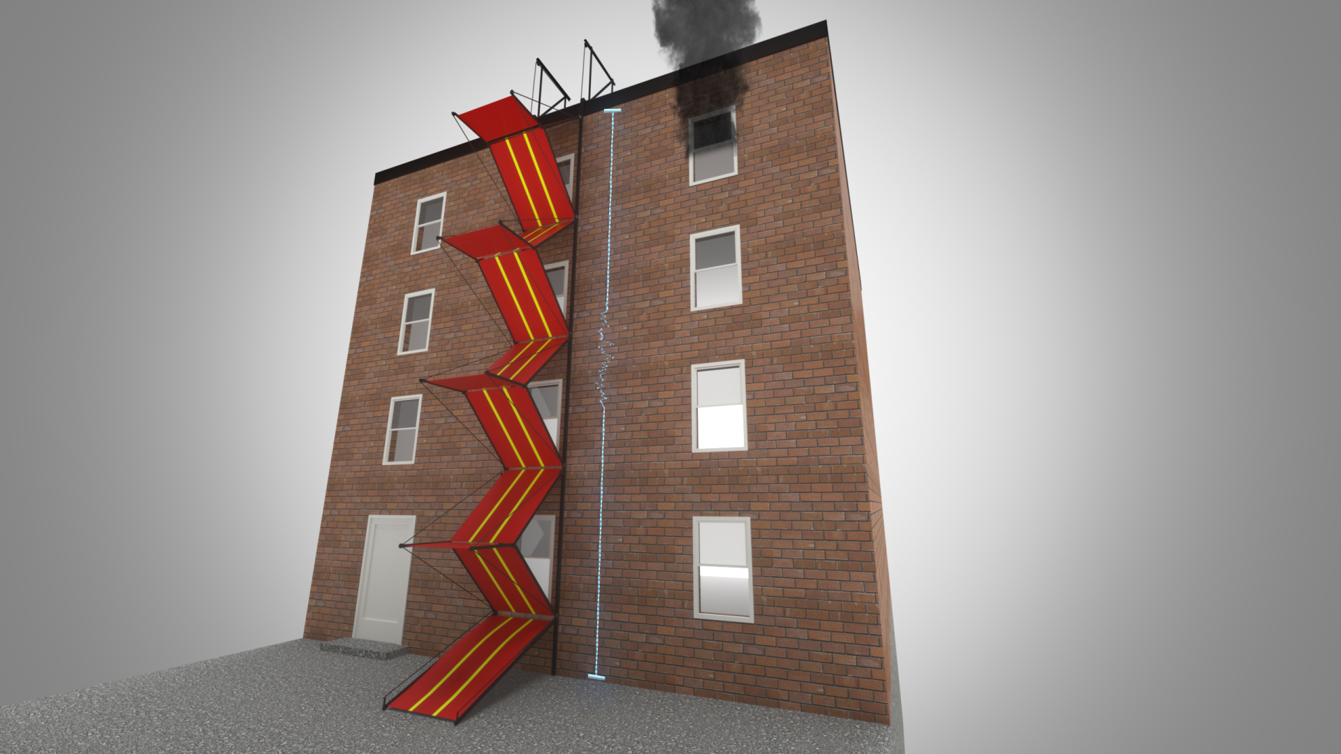 His father had a small 3-story building in New York City with a traditional fire escape. However, they always had problems on the faade due to the oxidation and weight of the fire escape, leading to cracking. One day while Conde and his father were doing maintenance on the fire escape, they discussed removing it. Conde realized that most roofs in New York City are not pitched and so he started thinking about what could be done to keep this form of exit and reduce the weight of the structure. He also thought about the handicapped. How does a person with limited or no mobility get out of a building through a traditional system? They dont! The fire department must come in and get them out. This is a critical design flaw.