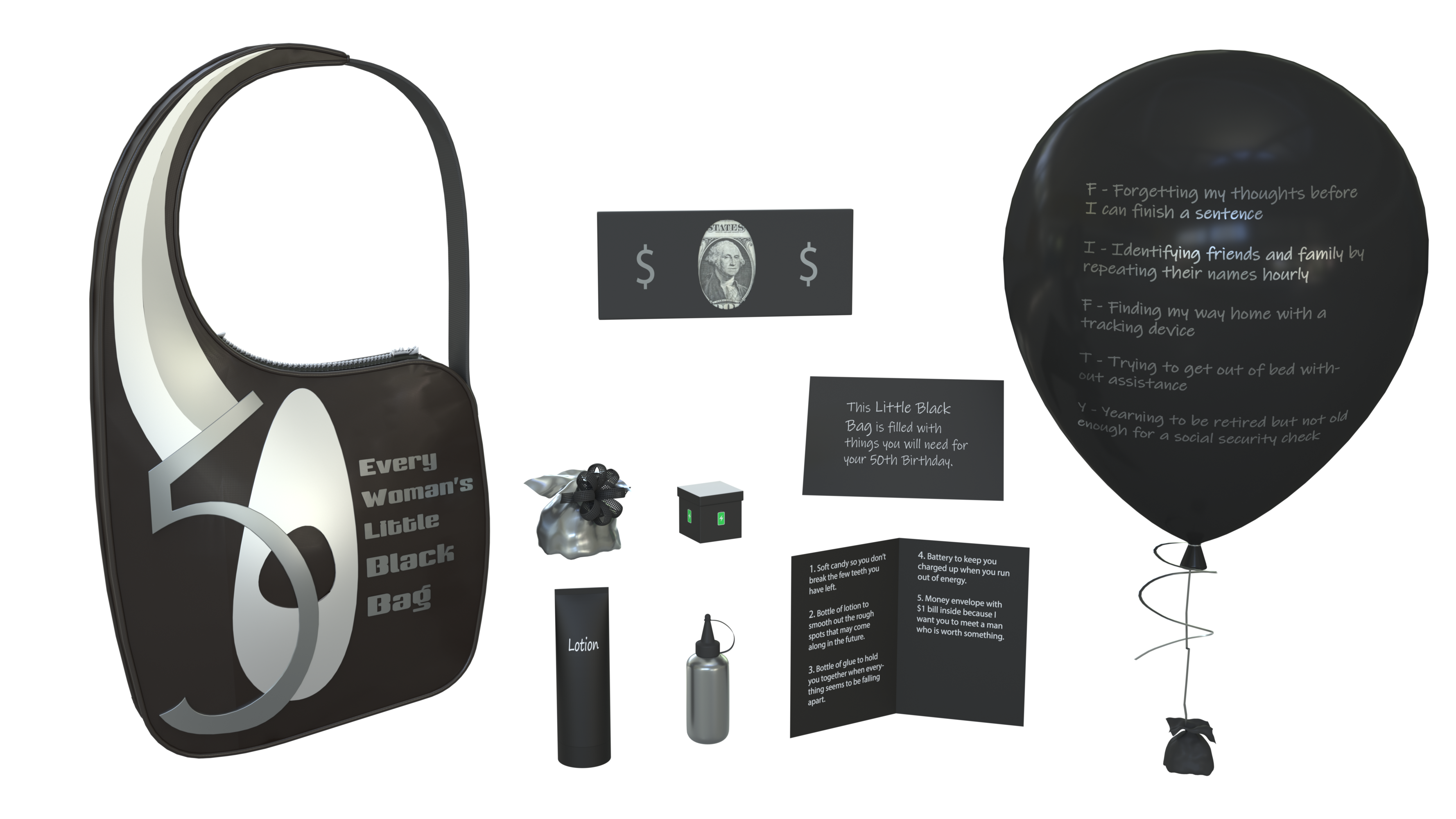 How it works: The birthday person is presented with the gift bag. A funny card is taken out and read in front of the party guests for everyones amusement. Each item in the bag represents the things we need to function on a daily basis and makes light of growing older. The items allow everyone to laugh and celebrate the many experiences and accomplishments made over five decades. The birthday balloon also has comical rhetoric and should be placed on the table in front of the birthday person for all to see.