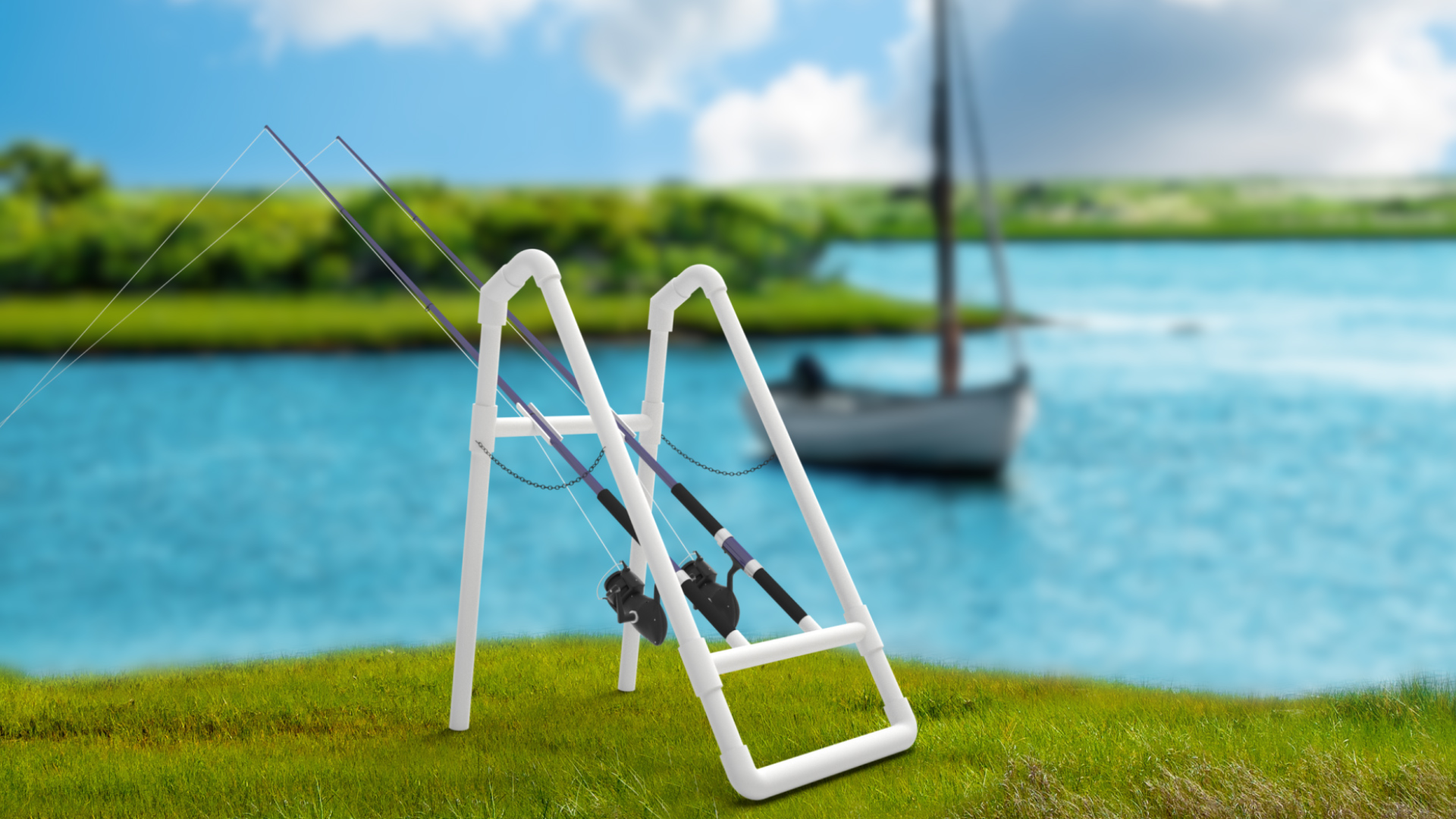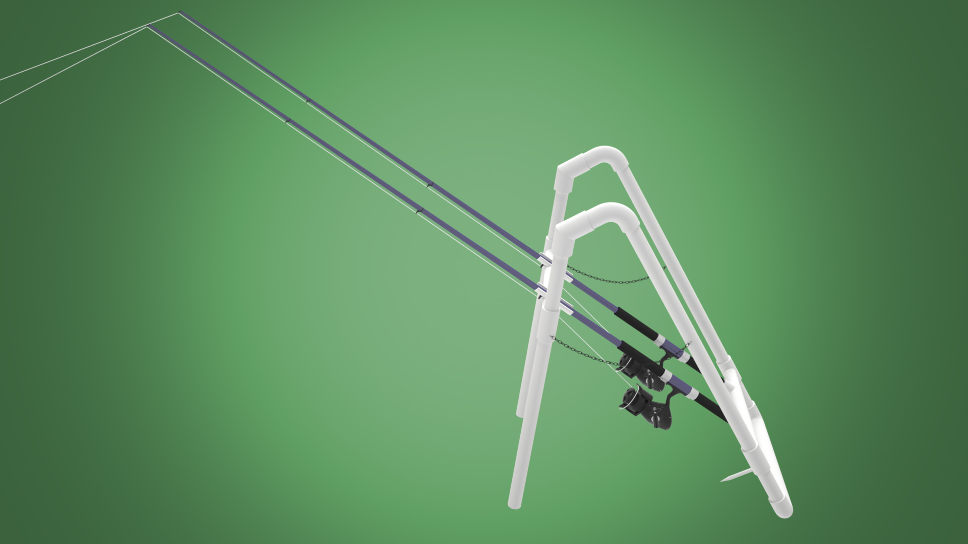 This clever new invention is a hands-free device designed to hold two fishing rods at 45 degrees, so you can easily land a catch! When the rod goes down, the fish is on! Two safety chains and a ground stake have been incorporated to stabilize the unit. Now anyone will want to go fishing since they wont have to hold the rod or worry about a fish taking off with the rod!