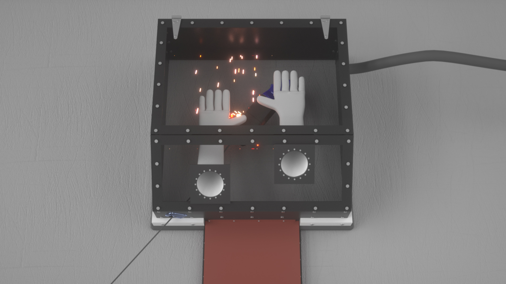 Once the Grinding Hood is in position, users will place the vacuum where theyd like it to be and route the hose into the enclosure. They will place the necessary tools inside, turn on the vacuum, and adjust the air intake. This setup will allow them to safely grind, sand, drill, paint, or chemical wash without exposing them to the material.