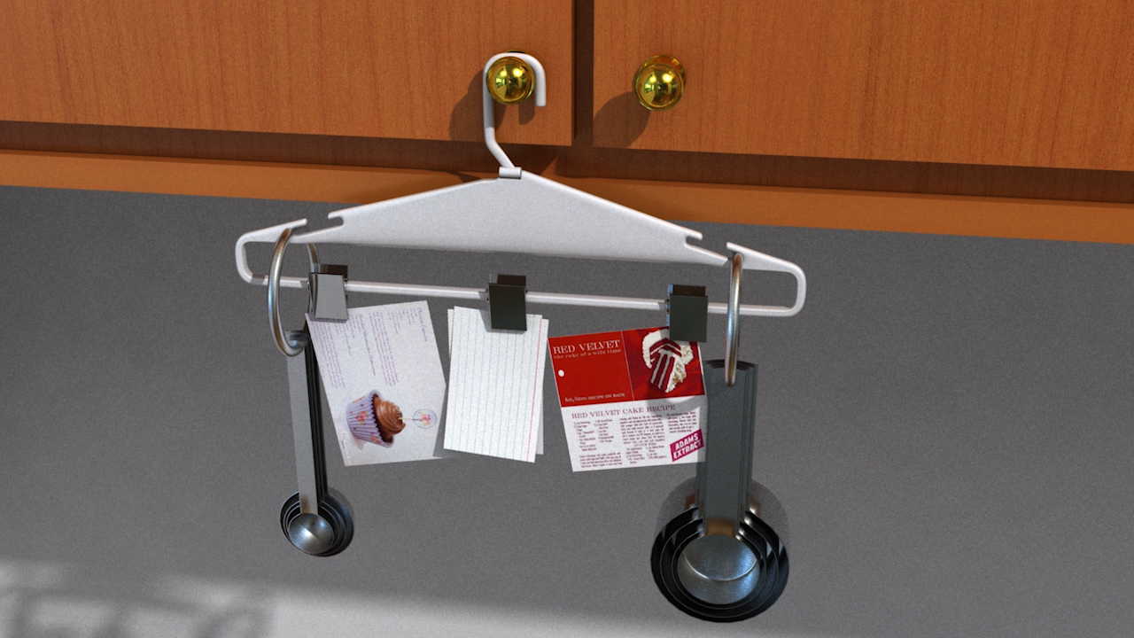 Cooking involves a lot of recipes and ingredients that are frequently spread all over the countertop together. All too often items like flour, sugar, spices, water, and vegetable oil stain recipe sheets to the point where theyre unreadable or ruined completely. In addition, having to constantly look down to follow along with a recipe can be bothersome and cause neck aches. As an avid cook and recipe collector, Inventor Lohman was inspired to create the Hanging Recipe Holder. Now recipes are able to be displayed over your cupboard door knob in a manner which is quick, easy, and effective.