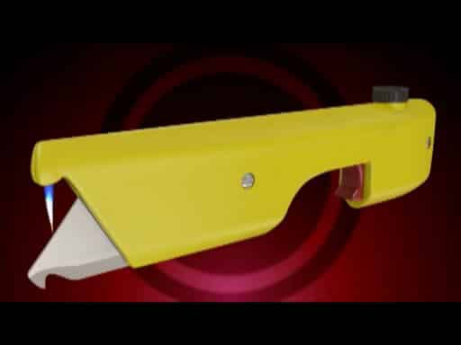 The Heated Utility Knife is a construction knife with an integral butane heating system that provides users the ability to easily cut through asphalt shingles and other materials.