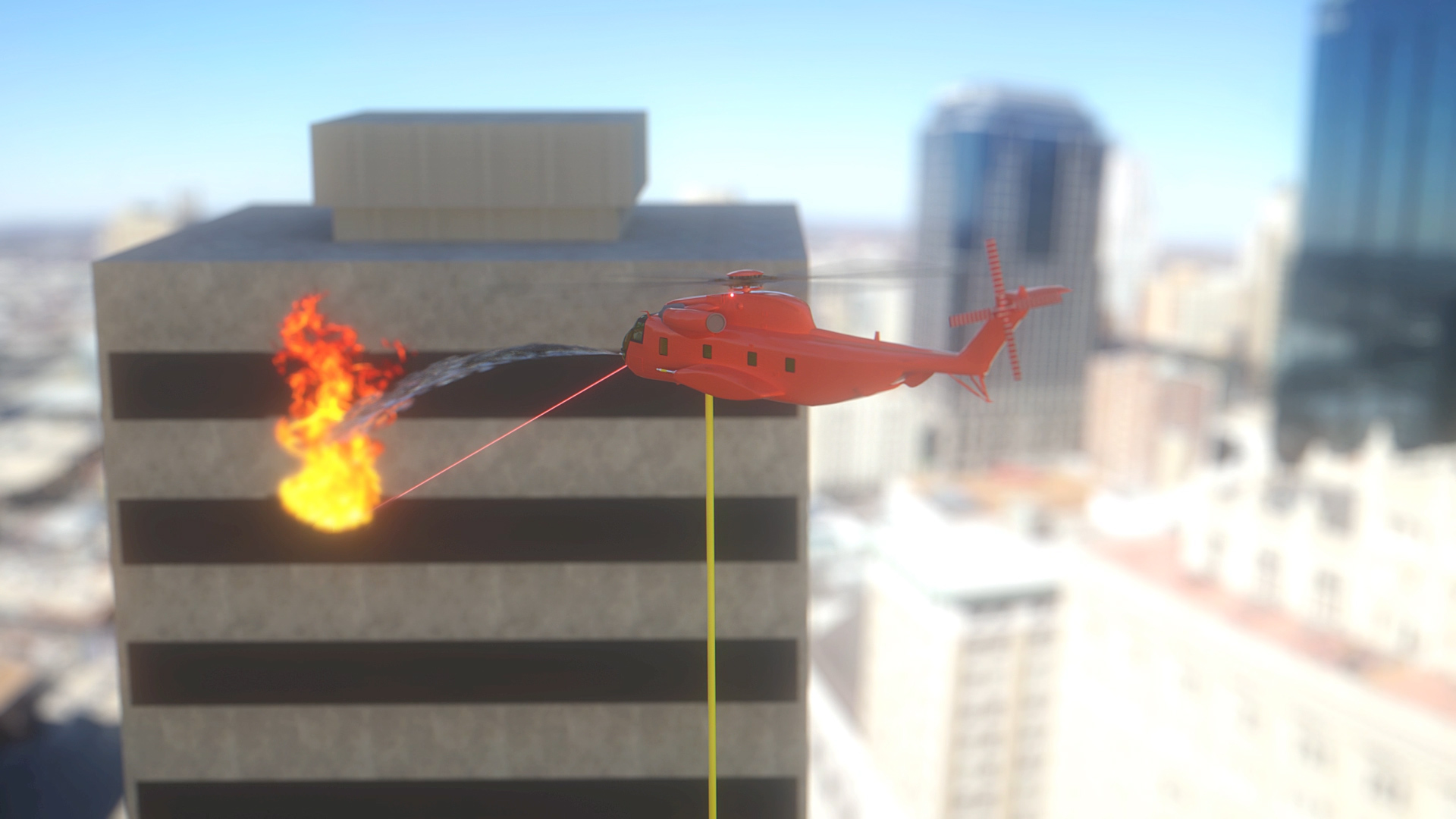 This clever new invention was created to fight fires in half the time! A helicopter equipped with the system will be flown to the site of a fire, such as a high-rise building or a forest fire. A decision to use the water cannon, the foam cannon, and/or the retardant cannon will be made. When using the foam cannon or retardant cannon, the pilot will use a laser targeting system and targeting computer to zero in on the fire. Should one decide to fight the fire with the water cannon, the pilot will lower the water pump to a nearby body of water. Water will be pumped to the system via a flexible hose and will be discharged over the fire. For a fire in a high-rise building, the helicopter will be equipped with a 2500-3000 ft. hose that will be lowered to a fire truck pumper, that will be connected to a fire hydrant. Should windows need to be broken, a remotely operated shotgun will be used with the aid of the laser targeting system.