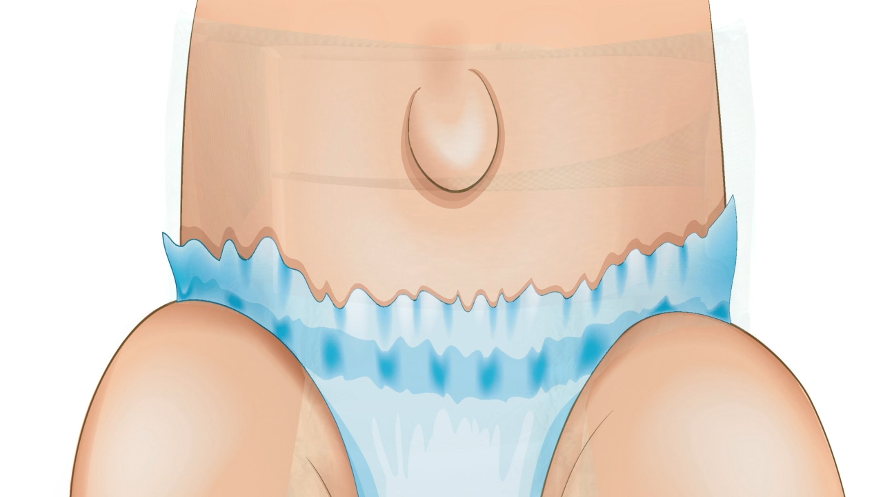 A disposable diaper with a modified design to accommodate umbilical hernias.