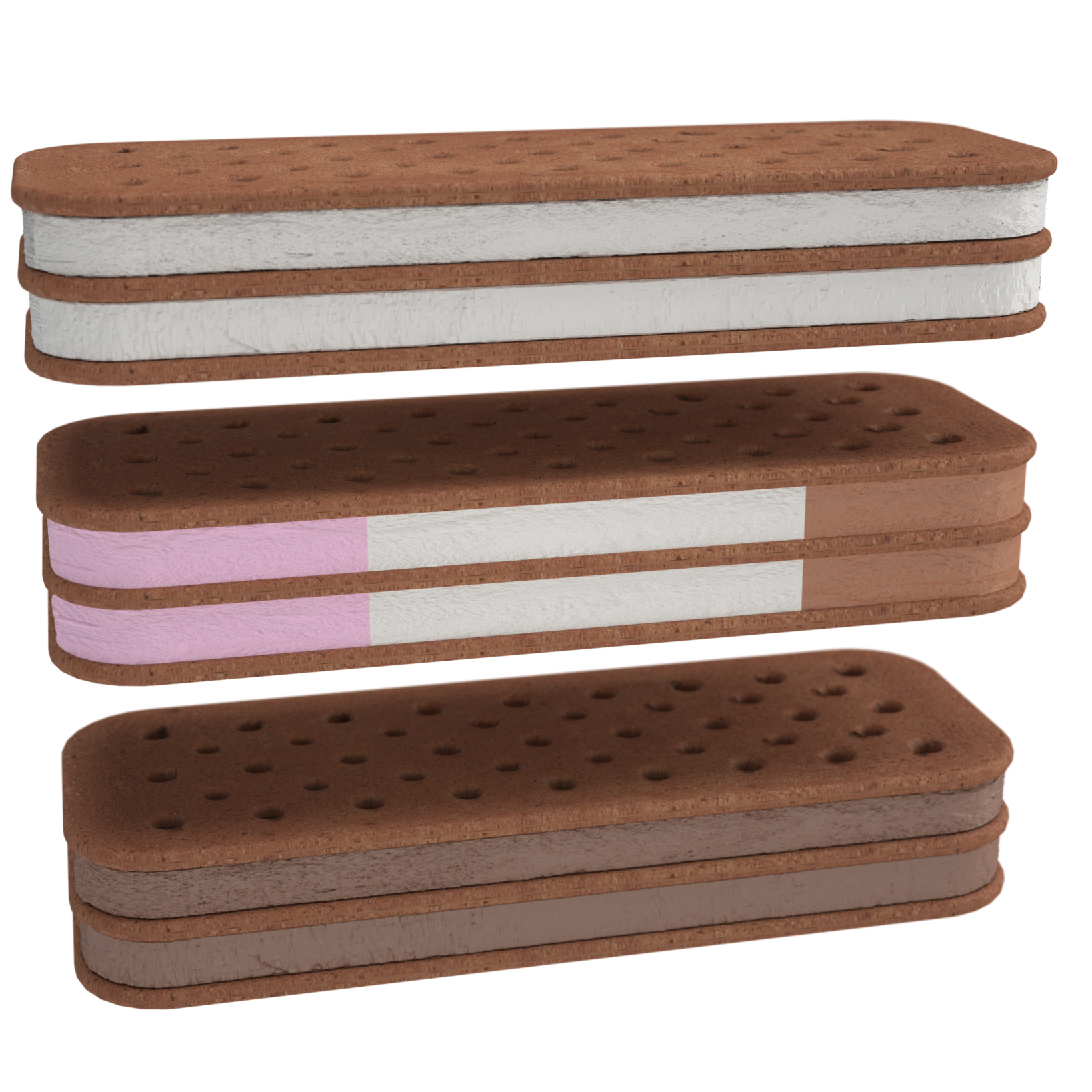 This new double decker ice cream sandwich uses three chocolate wafers. The wafers are positioned on the top, bottom, and middle of the sandwich. This allows for two different layers of ice cream. Selections could include vanilla and vanilla, chocolate and chocolate, vanilla and chocolate, strawberry and vanilla, and so on.