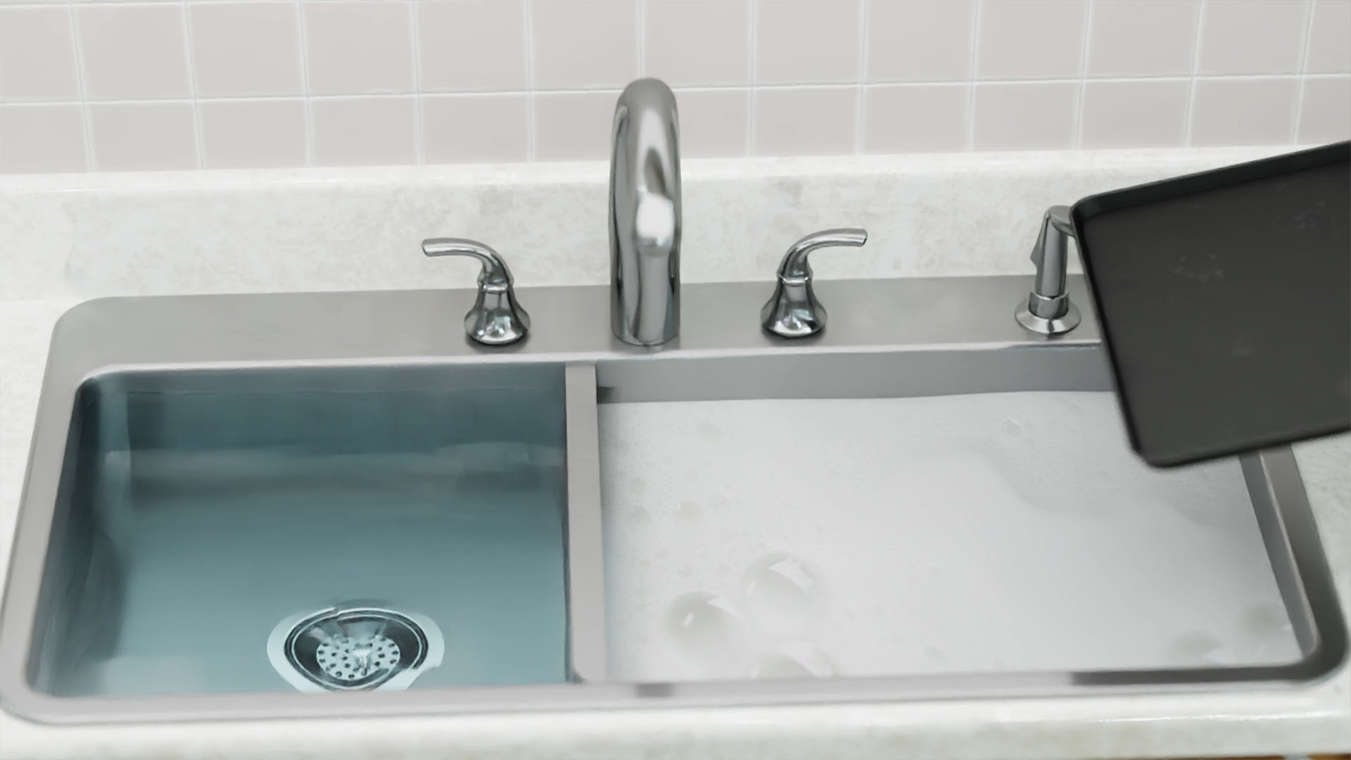 But how does it work? Imagine first washing smaller dishes in a two-sided set up, then when it comes time to wash the bigger items, simply swing the center divider out of the way while you still have water in the sink. This combines the two sides into one large basin that is already filled with soapy water. Now, not only do you have the needed room to wash oversized items, but you can use the existing water, eliminating the need to run your faucet continuously as you finish up the dishes. Imagine the flexibility and the water savings!