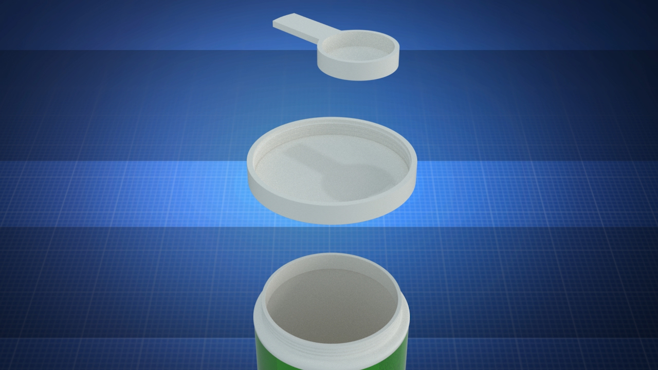 The scoop has been designed to be used with protein powders, baby formulas, lemonade, and more. Not only is it convenient, its sanitary! It easily attaches to the bottom of the lid, whether its after opening a new container or for use thereafter. It is simple to manufacture.
