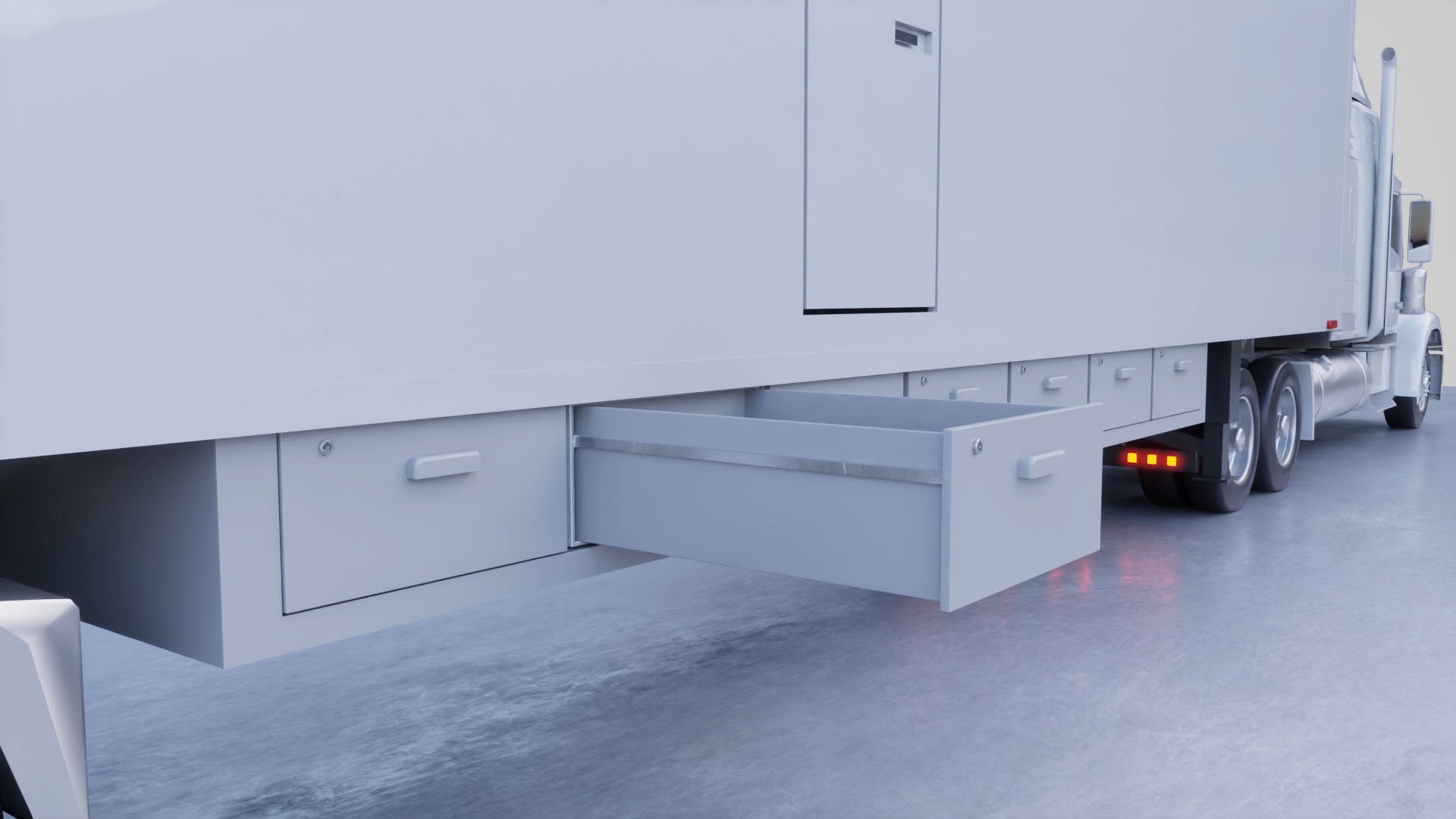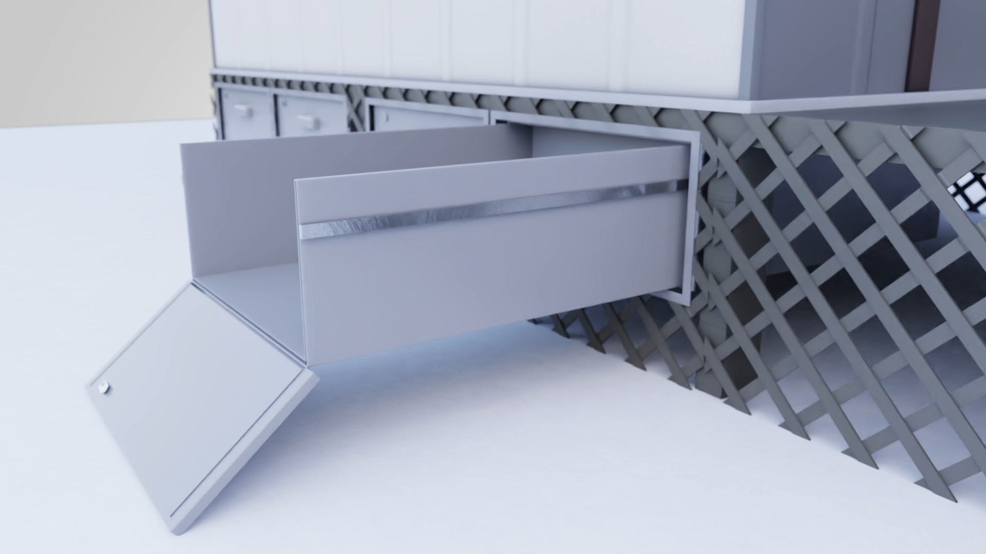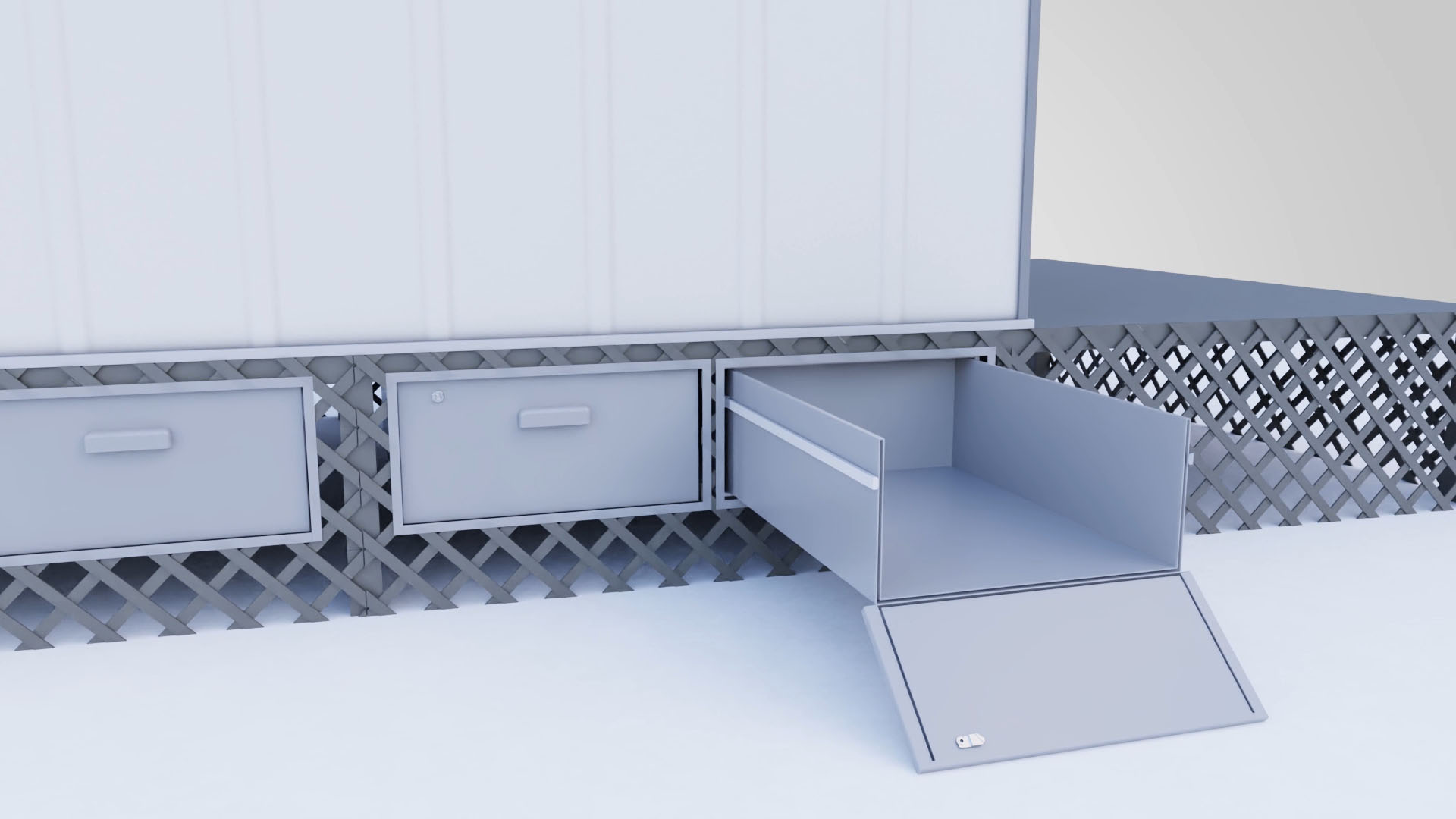 Imagine a storage unit that operates similarly to a massive drawer and can be attached to the bottom of various structures, including houses, mobile homes, trailers, campers, porches, barns, sheds, or even tents. This inventive design allows you to transform virtually any space you desire into a practical storage solution. Featuring a tailgate storage mechanism, the system can either fold down or slide out, effectively becoming a robust ramp. This clever feature facilitates the easy loading and unloading of items, making it incredibly user-friendly.
