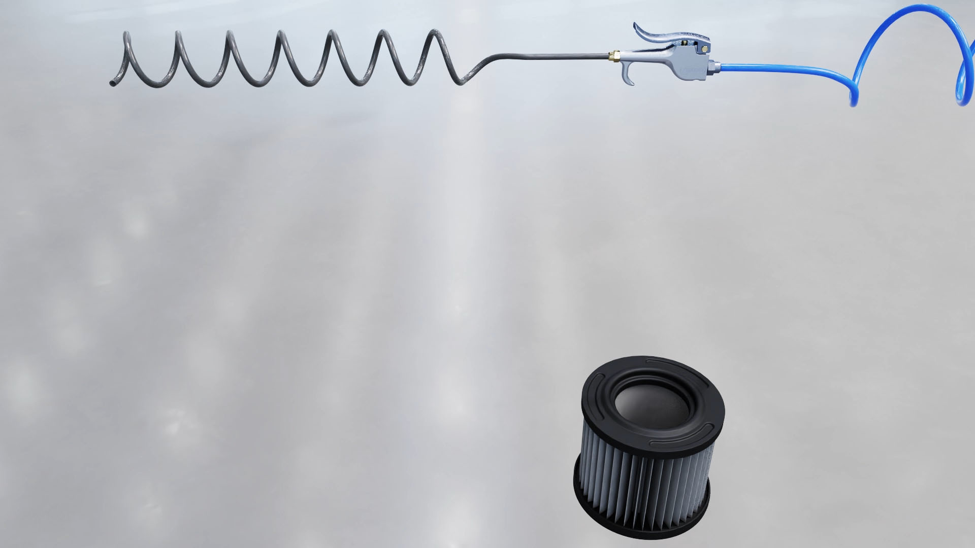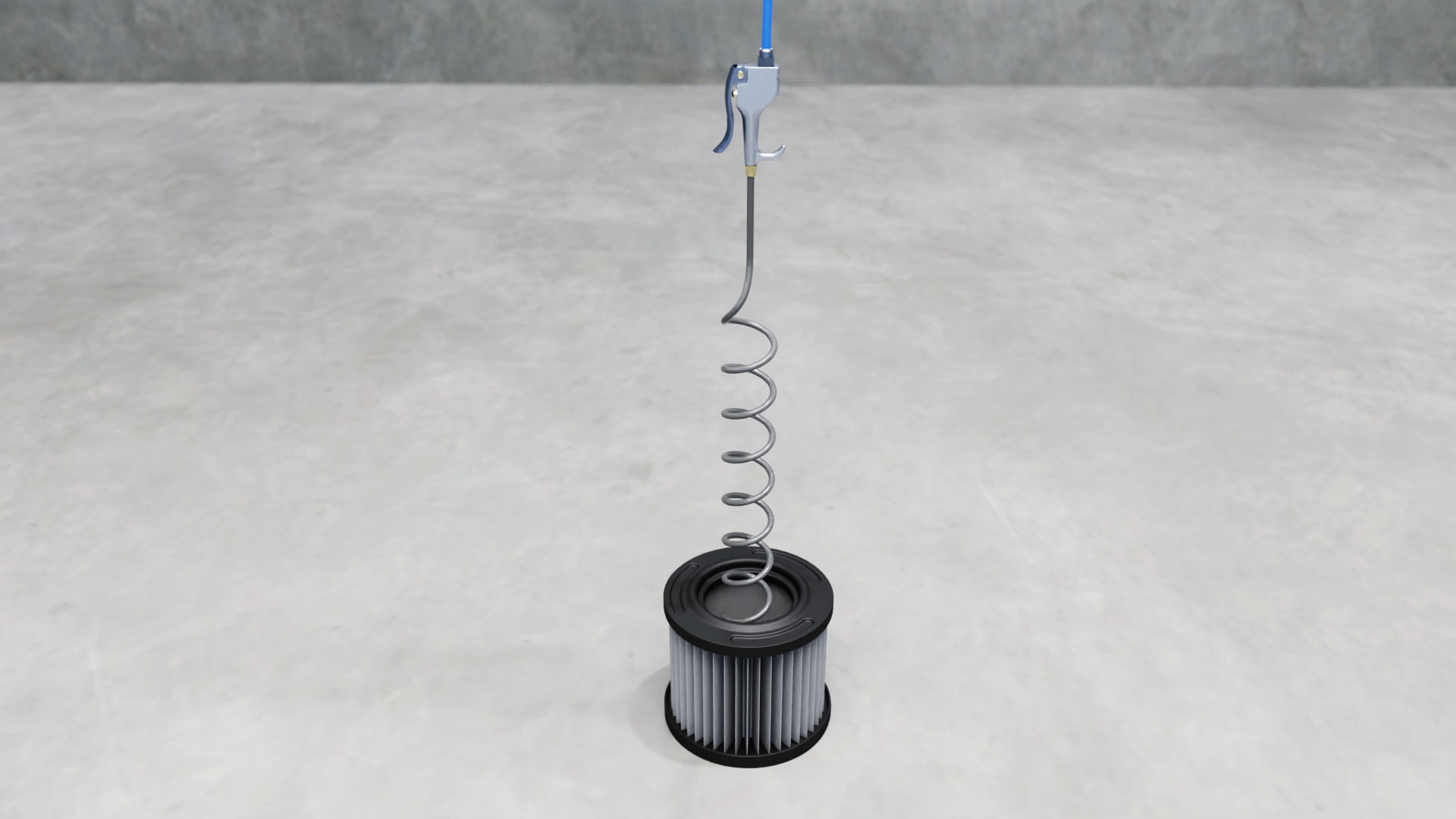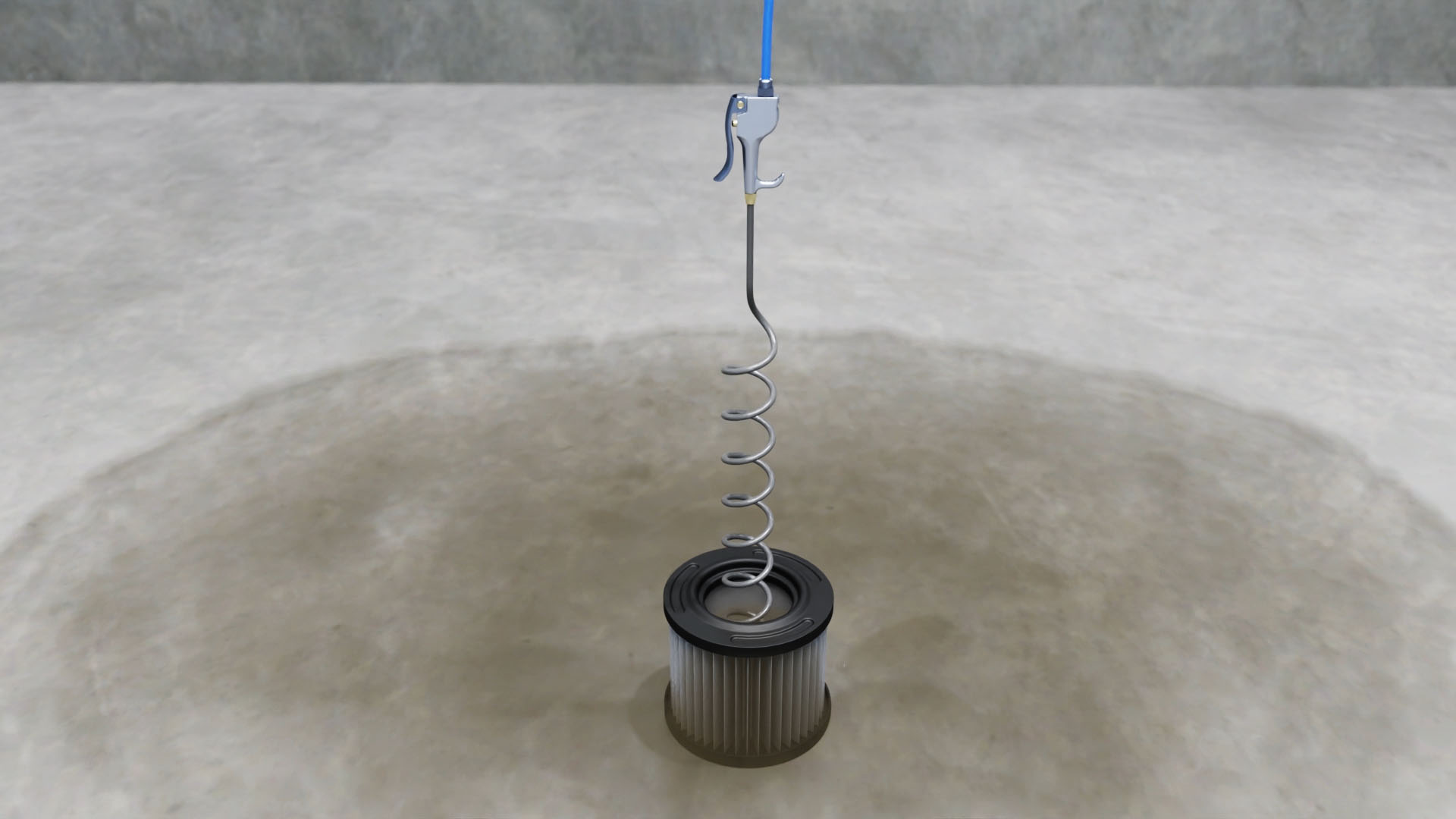 But how does it work? The tool features an elongated coil that is placed into the cavity of a round air filter. When the actuator is actuated, air enters the first end, flows through the interior of the coil, and exits through the opening. The pressure of the air exiting the opening causes the coil to rotate. As it rotates, the air pressure pushes dust and debris from the porous material of the air filter.