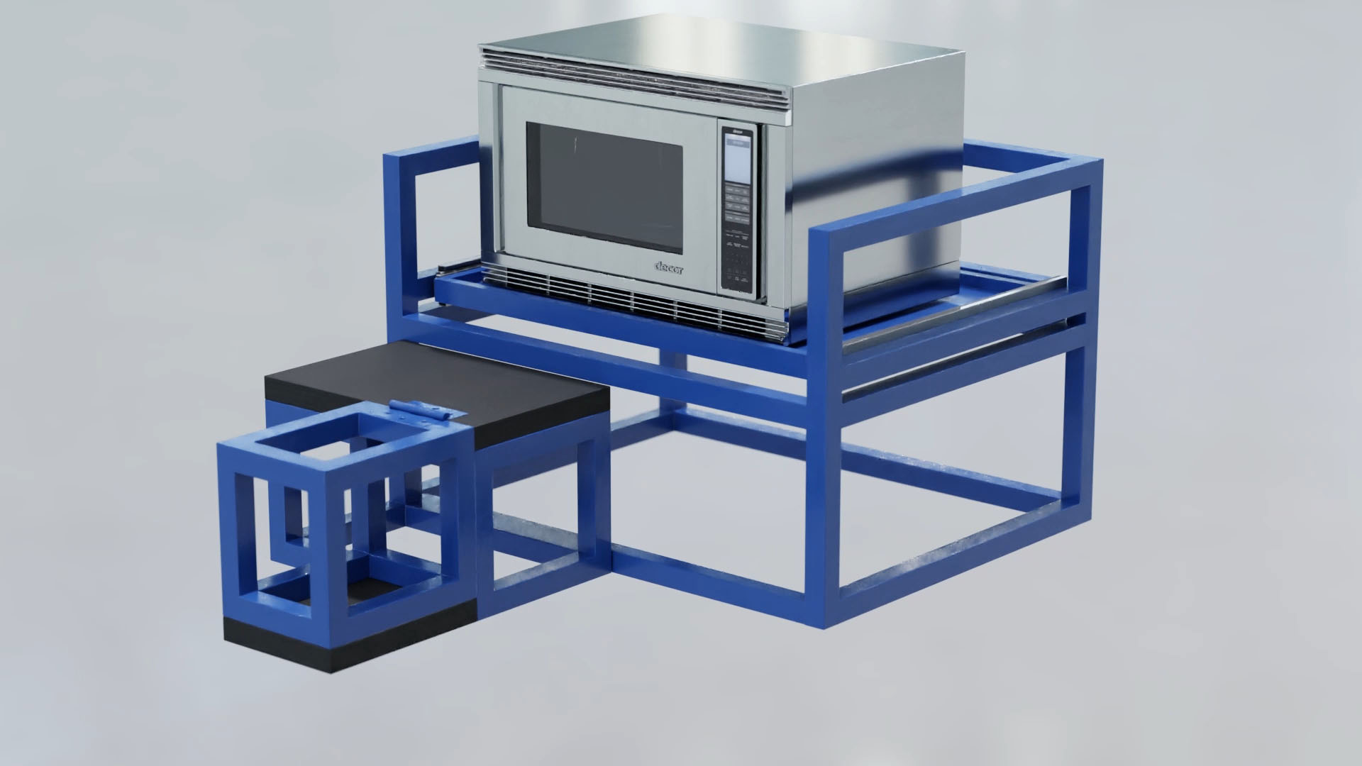 A sliding storage shelf that holds an appliance in an RV or tiny house and provides access to higher areas or items with the use of steps.