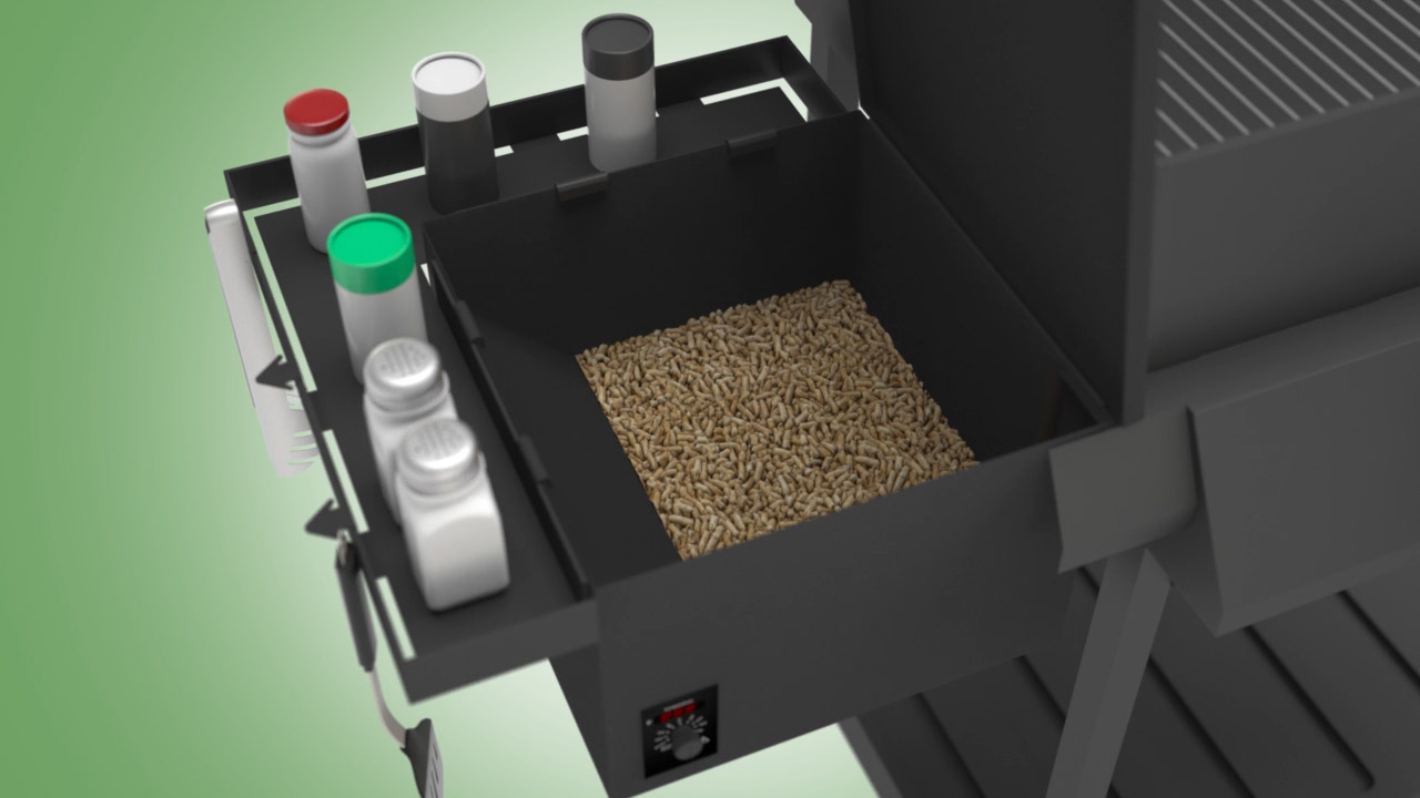Pellet smokers are becoming very popular. The boxes use hardwood pellets to impart a special smoked taste to meats, vegetables, and other foods. The boxes are typically housed in a hopper adjacent to the grill. Working together with the pellets are spices, which also add mouthwatering flavor. Many cooks may have up to a dozen different spices, all of which compete for limited storage space around the grill. Edwin was always placing his spices and a drink down on the pellet hopper lid. When the time came to add more pellets, he would have to move everything! Together, Edwin and Leo just knew there had to be a better way. In turn, they designed the Smoker Spice Tray!