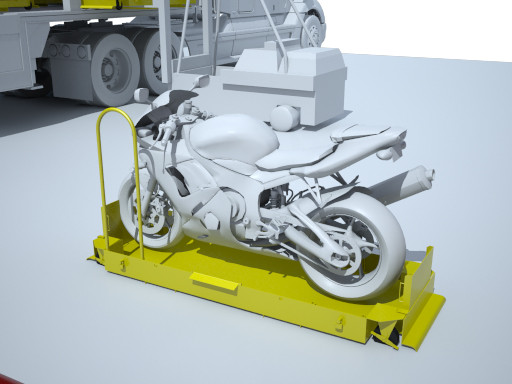 This clever new invention has end ramps for secure loading and unloading of motorcycles, a low profile for stability, a forklift attachment for rack storage, and four casters that rotate 360 for ease of mobility in tight quarters. The motorcycles are protected by not only a soft textile cover, but a fiberglass hard-cover as well. The system can hold all factory manufactured motorcycles. The use of the Storage And Shipping Method For Motorcycles allows for short and long term storage and shipment of motorcycles in a manner that will not damage the cycle and is easy for the user.