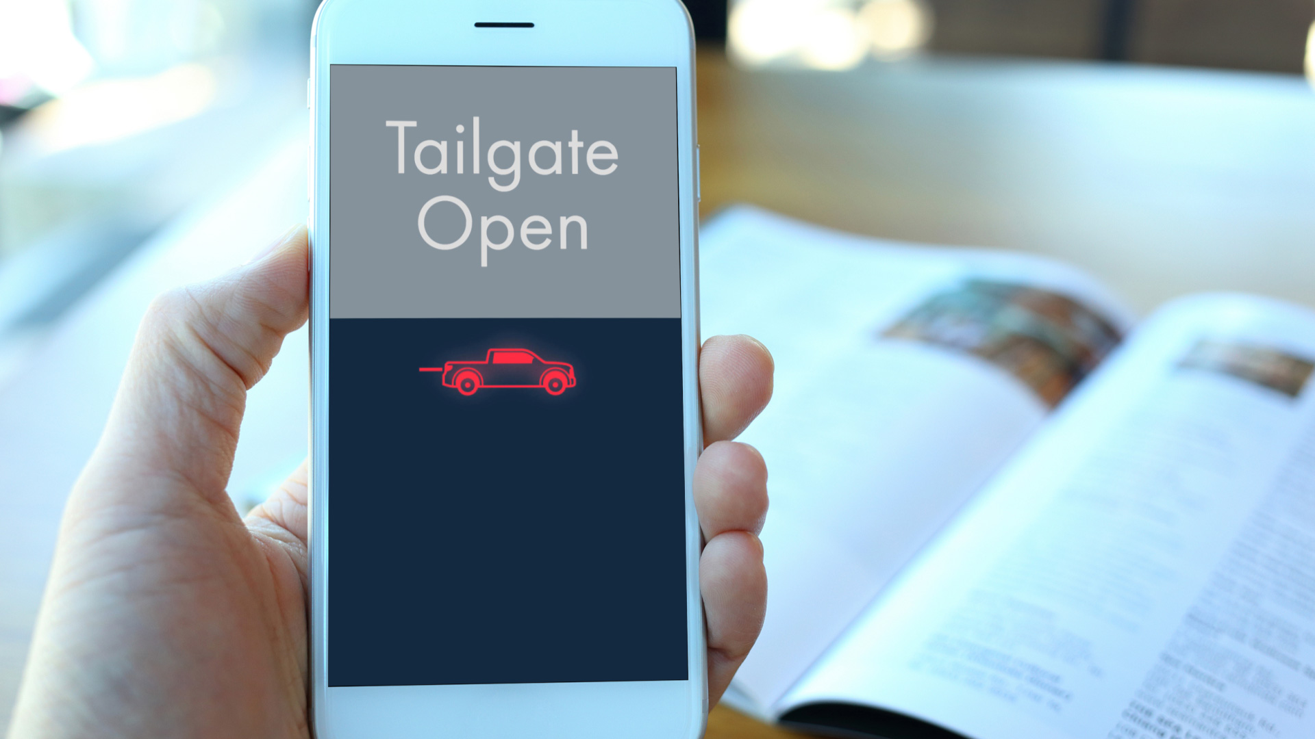 The rear tailgate area is provided with a sensor that is easily installed in the location of an existing bolt. This sensor communicates via Bluetooth to a smart phone or high intensity indicator light that illuminates when the tailgate is in the down position. This visual indication will provide peace of mind, while also doubling as a safety feature to tell you if someone is opening the tailgate. It will be rugged and made to last.