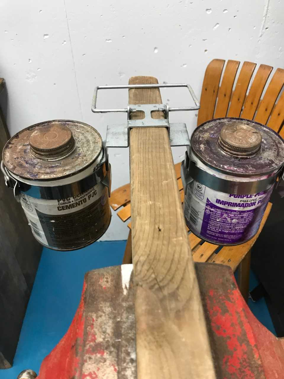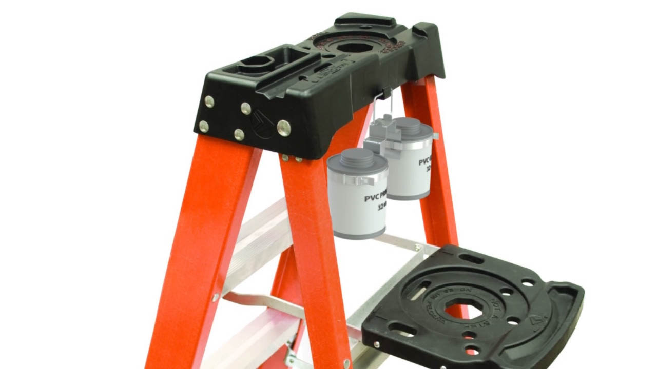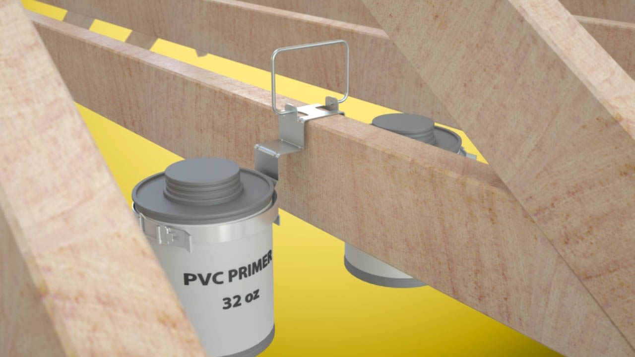 The invention is portable and easy to use. It is designed to fit over the top of rafters, the top plate of walls, and the steps of industry ladders. The handle allows for safe carry and fits properly on the front hook of all industry ladders. The locking bands are made to fit 32 oz. cans of glue and primer that are primarily used by plumbers using solvent welding, PVC, CPVC, etc. The band locking system makes exchanging cans safer and easier. It is more stable, more productive, and causes less waste.