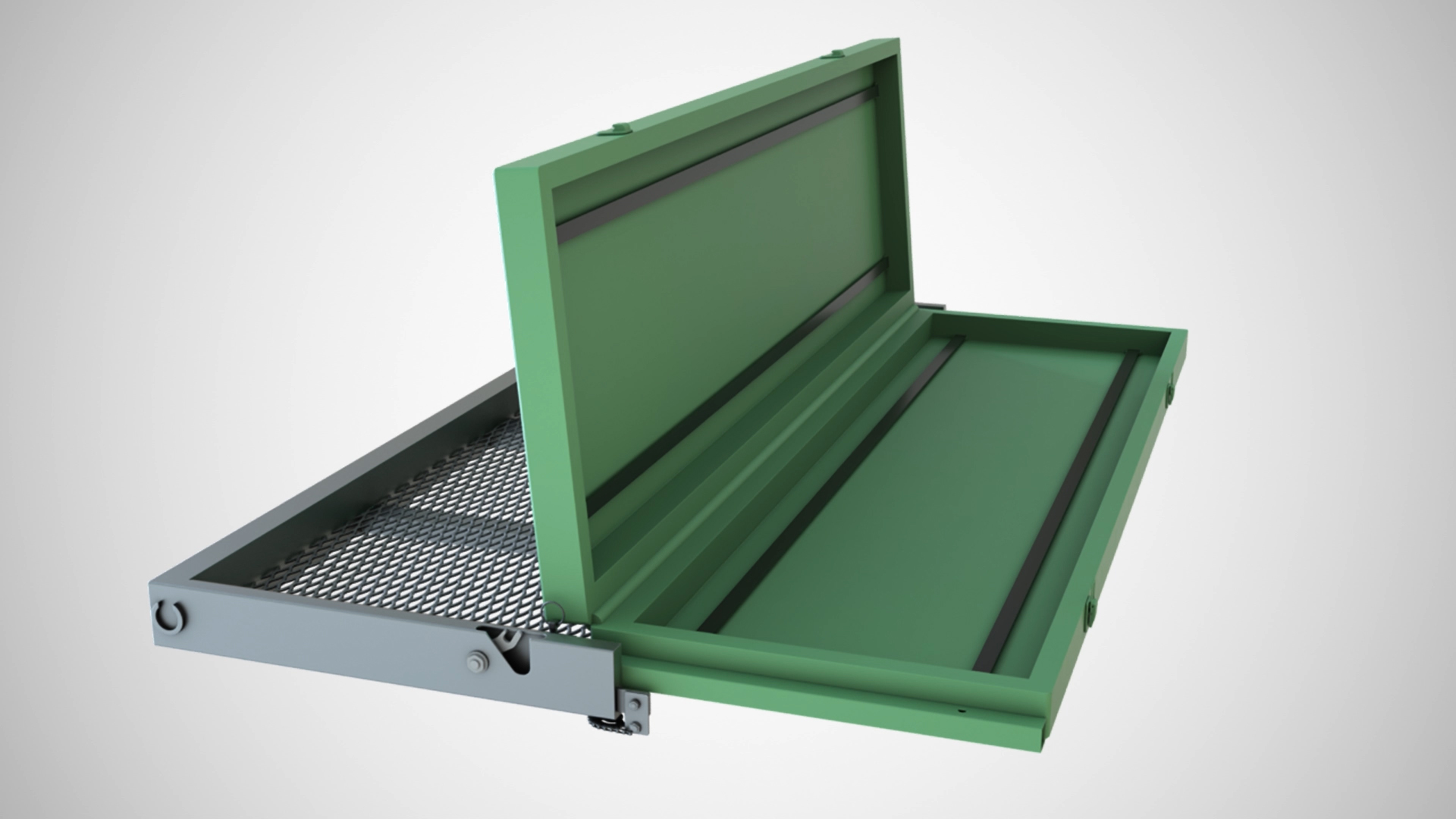 The NateGate is an extendable modular tailgate. It features an internal slide that extends out and pins securely into place, giving the NateGate its unique ability to support longer or taller loads. This will be ideal for hauling appliances, furniture, and long construction materials. The slide is fully removable, allowing for replacement, weight reduction, or swap with our other accessories. The toolbox and ramp accessories are now available. It is available in aluminum or steel and can be produced with a mesh or solid metal skin.