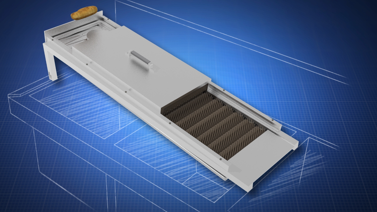 One day, Inventor Frew was at work grinding hamburger and noticed a nearby prep cook was struggling while washing potatoes. He turned to his right, saw a vegetable slicer, and put the two together. Thats when his idea for The Spud Buddy was born.