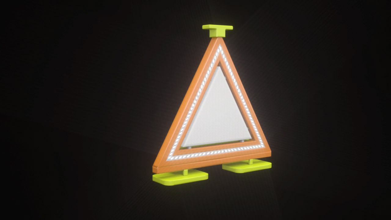An illuminated flashing roadside warning triangle.