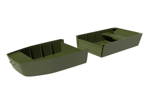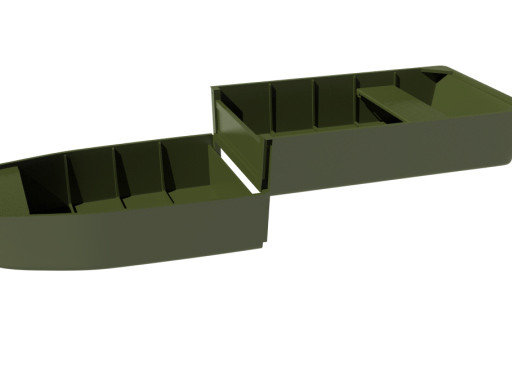 This clever new invention forms a completely watertight hull. It conserves space during storage and transportation. It provides removable snap-in seats. Two halves fit inside one another for storage. It is perfect for camping and fishing. The use of the Two-Piece Modular Boat provides users with the benefit of a full-size aluminum flat boat, but without the burden of storage or transport.