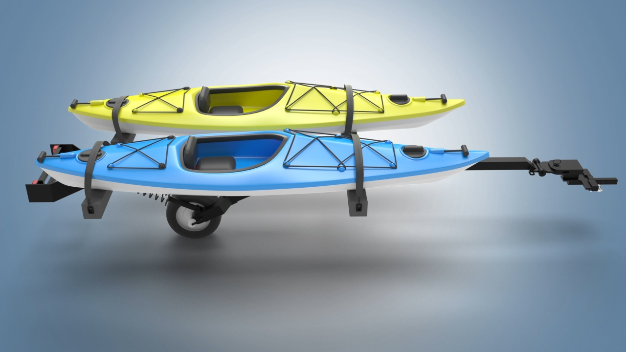 A new small lightweight one-wheel trailer designed to carry two kayaks or a canoe.